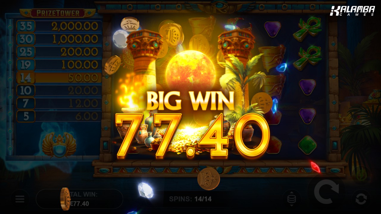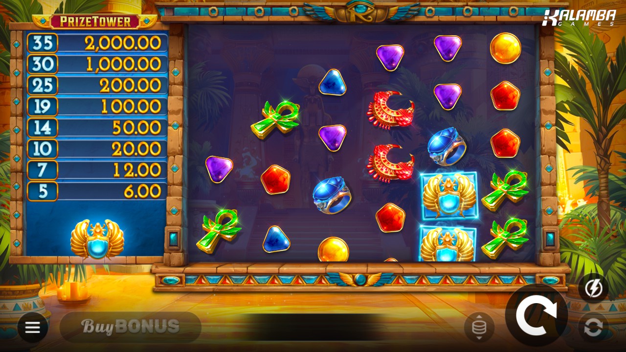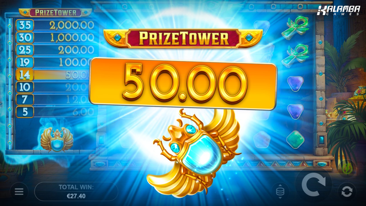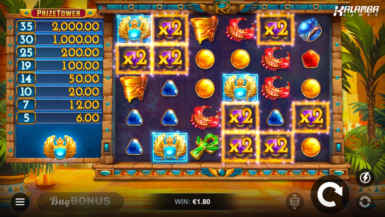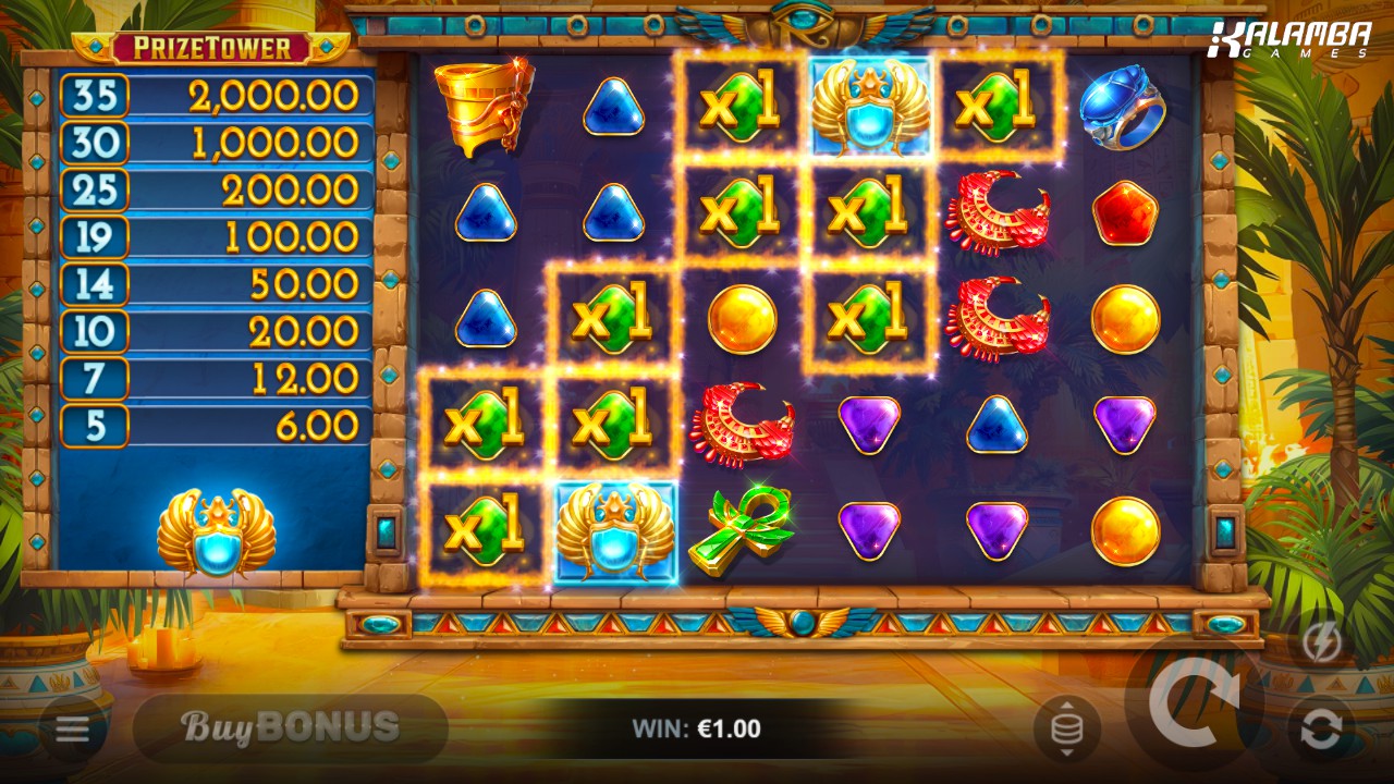 PRIZETOWER – During the base game, land 5 special symbols to unlock the might PrizeTower – once launched, every symbol you collect fills the meter. At the end of the spin, or after the final tumble, you’ll unlock a prize based on your total. The meter resets before each new spin, so every round is a fresh shot!